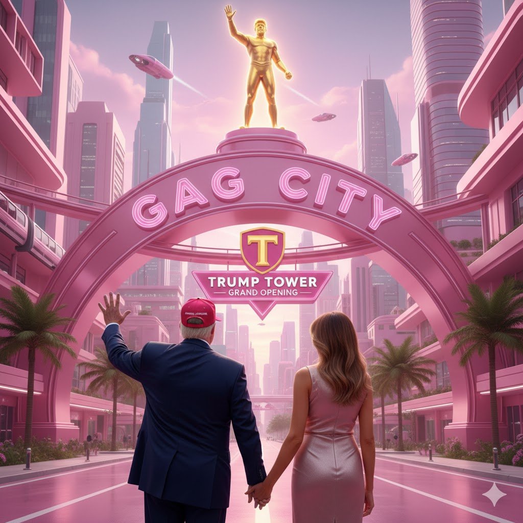 And now, Gag City’s excitement has reached new heights as President Trump and First Lady Melania arrive for the grand opening of Trump Tower: Gag City Edition.
