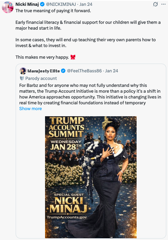 Nicki Minaj is preparing for the Trump Accounts Summit on January 28, 2026, joining 2X Winning President Donald Trump and 79th United States Secretary of the Treasury Scott Bessent for a high-profile conversation around the new financial initiative designed to help children and families build generational wealth through the Trump Accounts initiative.
